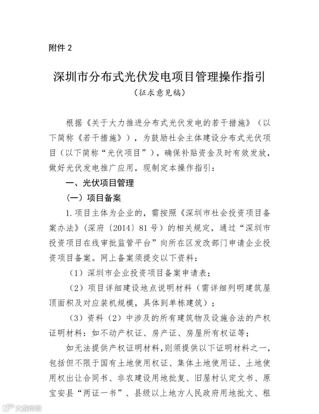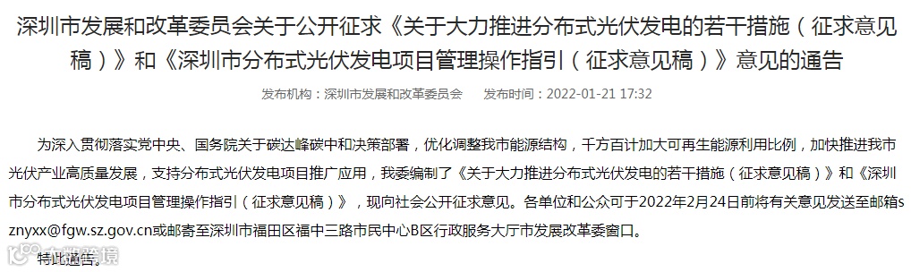 深圳市发展和改革委员会关于公开征求《关于大力推进分布式光伏发电的若干措施(征求意见稿)》和《深圳市分布式光伏发电项目管理操作指引(征求意见稿)》意见的通告