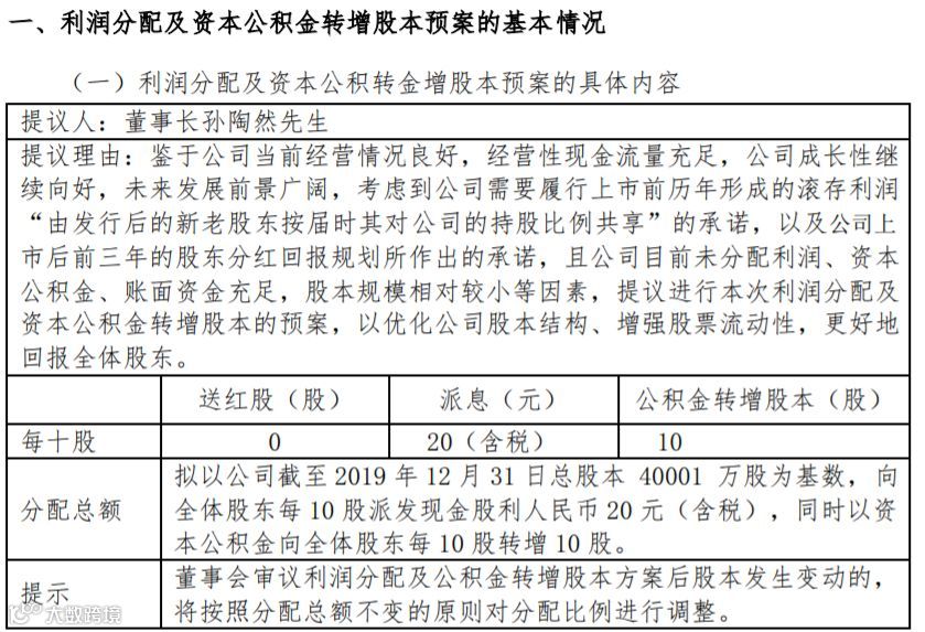 根据公告,具体方案是拟以公司截至2019年12月31日总股本40001万股为基数,向全体股东每10股派发现金股利人民币20元(含税),同时以资本公积金向全体股东每10股转增10股。