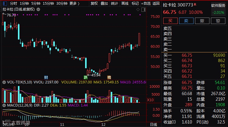 受拉卡拉的利好公告影响,拉卡拉公司股价在12月27日午后强势崛起,盘中直线拉上涨停板。