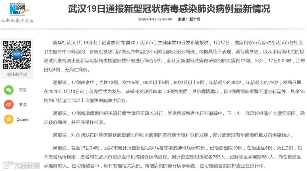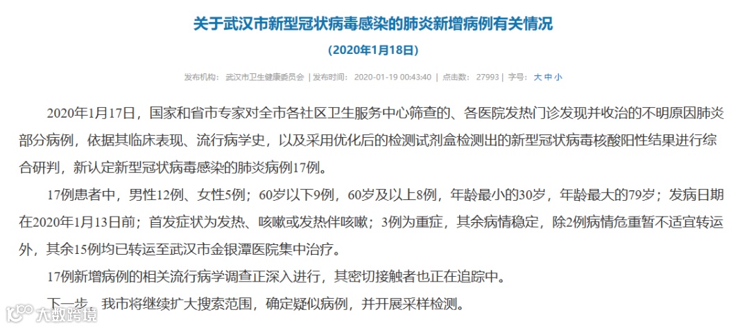 据武汉市卫生健康委网站19日发布通报称,2020年1月17日,国家和省市专家对全市各社区卫生服务中心筛查的、各医院发热门诊发现并收治的不明原因肺炎部分病例,依据其临床表现、流行病学史,以及采用优化后的检测试剂盒检测出的新型冠状病毒核酸阳性结果进行综合研判,新认定新型冠状病毒感染的肺炎病例17例。