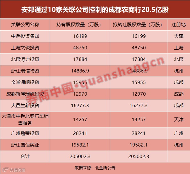 根据北金所信息,此番挂拍的成都农商行股权包括两部分:安邦直接持有的35亿股,安邦10家关联公司合计持有的20.5亿股,转让价合计261.77亿元。
