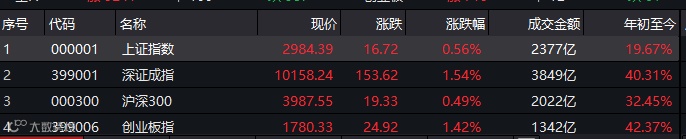 就在外围不断突破历史之际,A股市场也在偷偷地创新高。本周一,上证指数收涨0.56%,报2984.39点,创一个月新高;深证成指涨1.54%,报10158.24点,创8个月新高;创业板指涨1.42%,报1780.33点,创年内收盘新高。