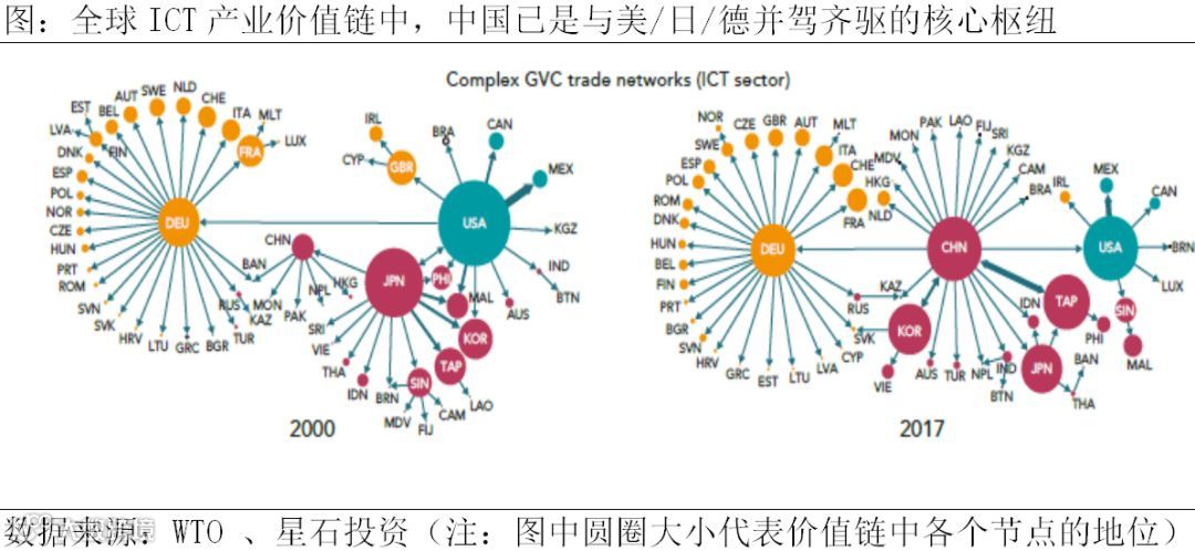 一方面,研发投入持续高增,中国在全球价值链中地位持续上移。从ICT(信息与通信技术)产业的全球价值链来看,我国已是与美/日/德并驾齐驱的核心枢纽。