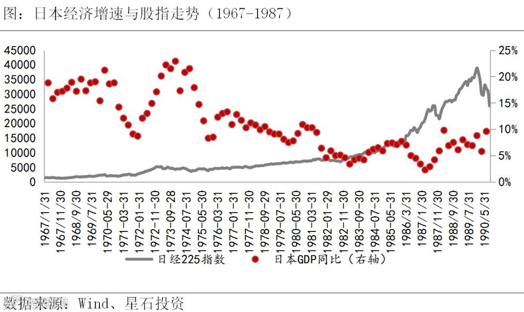 1967年末至1987年,日经225指数翻了近30倍。同期日本GDP同比从20%左右下降至10%以下。这种股市与经济增长背离的牛市,核心驱动力同样来自于日本战后产业结构持续升级,企业盈利提升。1967-1987年虽然日本经济增速回落,但期间日本企业的ROE均值高达20.7%。