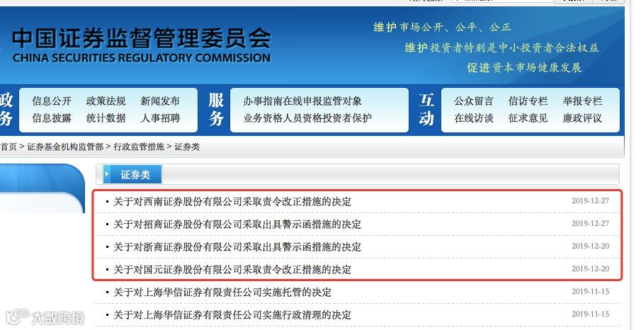因违反了《证券公司和证券投资基金管理公司合规管理办法》和《证券公司合规管理实施指引》的相关规定,12月12日,证监会一口气对国元证券、浙商证券、招商证券和西南证券4家券商采取了行政监管措施,并分别在12月20日和12月27日公开对外进行了披露。