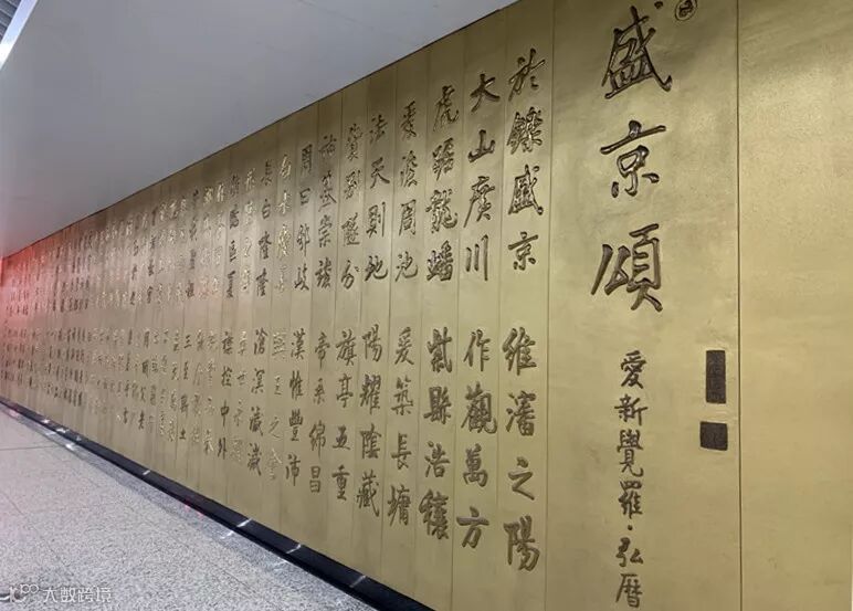 沈阳地铁一号线中街站内镌刻的《盛京赋》,描写盛京物产之丰富、人才之鼎盛,作者乾隆,于1743年赴盛京(沈阳)拜祭祖陵时所作,这也是中国历史上唯一一篇由皇帝撰写的城市赋。