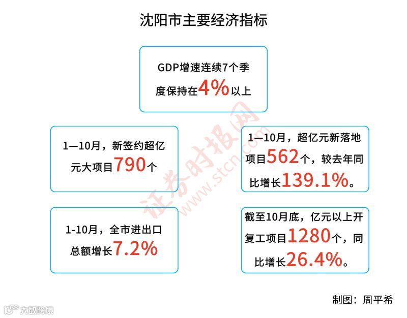 从主要经济指标来看,沈阳生产总值已连续7个季度增速保持在4%以上。1-10月,沈阳市新签约超亿元大项目790个;超亿元新落地项目562个,较去年同比增长139.1%,宝马、恒大、万达等一批国内外知名企业纷纷在沈投资。1-10月份,全市进出口总额增长7.2%。实际利用外资14亿美元,增长35.8%,其中制造业实际利用外资占比达到48.9%。截至10月底,沈阳市亿元以上开复工项目1280个,同比增长26.4%,总投资11886亿元,完成项目投资1664亿元。其中:续建项目770个,总投资7398亿元,完成项目投资877亿元;新建项目530个,总投资4488亿元,完成项目投资787亿元。
