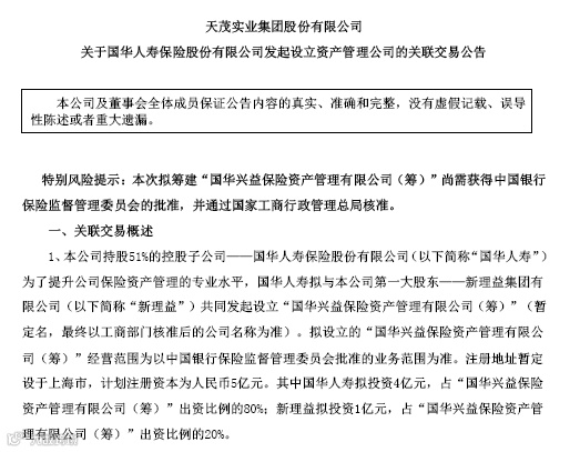 天茂集团于12月11日晚间公告,该公司持股51%的控股子公司国华人寿拟与公司第一大股东——新理益集团共同发起设立国华兴益保险资产管理有限公司(筹)。