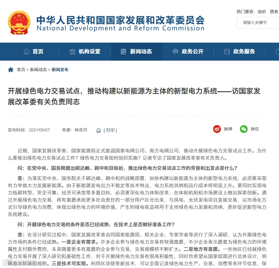 近期,国家发展改革委、国家能源局正式复函国家电网公司、南方电网公司,推动开展绿色电力交易试点工作。为什么要推出绿色电力交易试点工作?绿色电力交易如何组织实施?记者专访了国家发展改革委有关负责人。