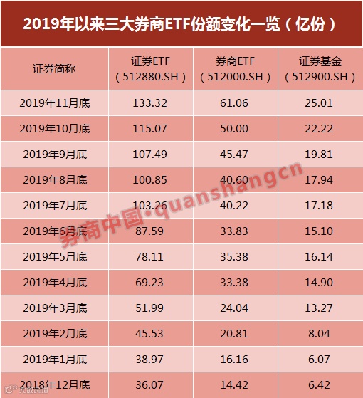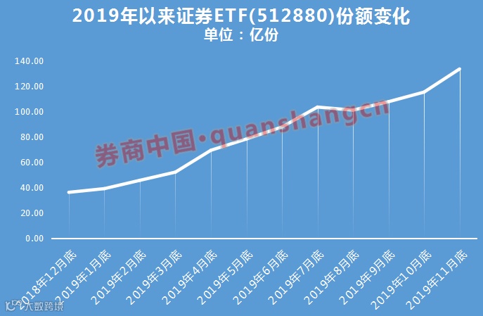 进入2019年,券商ETF获资金热捧。数据显示,证券ETF(512880.SH)由去年底的36.07亿份增加至11月底的133.32亿份,增加额度接近100亿份,特别是在最近一个月(11月份),单月增加了超18亿份,创下单月净买入纪录。