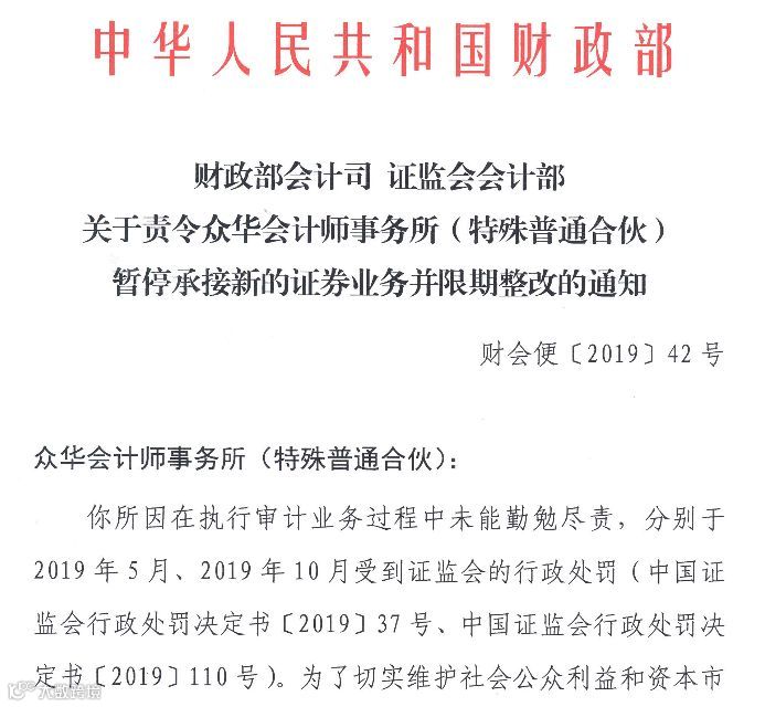 11月21日,财政部会计司和证监会会计部共同发布《责令众华会计师事务所暂停承接新的证券业务并限期整改的通知》(财会便【2019】42号)。由于在执行审计业务中未能勤勉尽责,在今年两度被罚,众华会计师事务所(简称“众华所”)自10月28日期暂停承接新的证券业务,需限期完成整改并提交整改报告。
