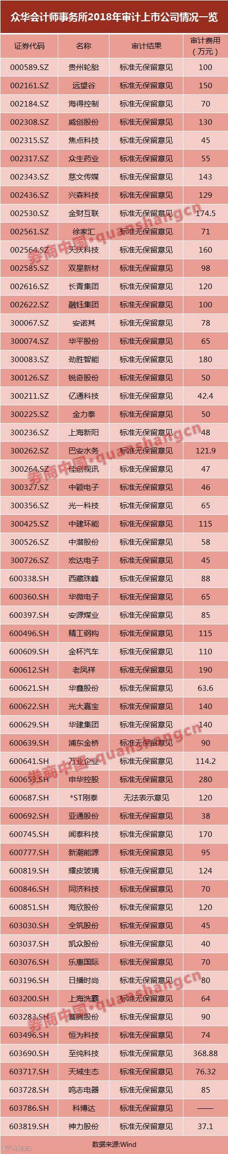 2018年,聘请众华所进行年审的上司公司共有59家。其中,披露审计费用的58家企业共为众华所贡献5804.90万元的业务收入。就审计结果来看,众华所仅对*ST刚泰给出“无法表示意见”,其余均为“标准无保留意见”。