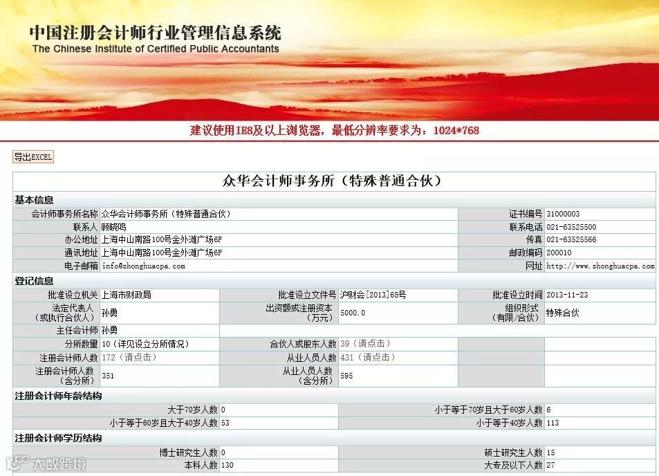 中注协信息显示,众华所于2013年11月批准设立,出资额为5000万元,法定代表人为孙勇。众华所共有10家分所,39名合伙人/股东,注册会计师351人(含分所)。2018年,众华所实现营业收入4.56亿元,排在第23位。