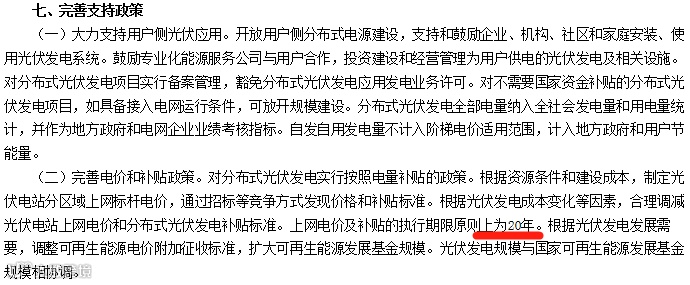 光伏发电国家补贴20年的政策出处主要有两处:一个出处为国务院于2013年07月04日发布的国发〔2013〕24号《国务院关于促进光伏产业健康发展的若干意见》。其中第七大条《完善支持政策》中明确指出:上网电价及补贴的执行期限原则上为20年。
