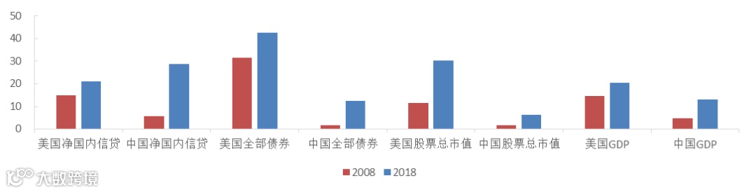我国现价GDP规模约为美国的三分之二。金融危机以来,我国经济、融资市场快速发展,但金融体系对间接融资的偏重,使得国内券商的直接融资市场规模相较美国,存在3-5倍的差距。按当期市场汇率折算,2018年末,我国净国内信贷29万亿美元,超过美国的21万亿美元。但股票总市值约6.3万亿美元,相当于美国股票总市值约30万亿美元的五分之一。债券市场存量13万亿美元,企业债存量2.9万亿美元;约相当于美国债券存量约43万亿美元、企业债存量9.2万亿美元的三分之一。市场规模的差异,必然在机构规模上有所体现。