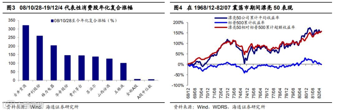 从细分行业来看,自2008年10月28日上证综指1664点以来,领涨前三的行业分别是食品饮料(857%)、家电(817%)、计算机(466%),从代表性个股角度看,2008年10月28日以来贵州茅台涨幅1589%、格力电器2232%、苏泊尔1515%、古井贡酒3529%等,显著高于全部A股涨幅的中位数62.3%。