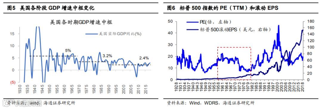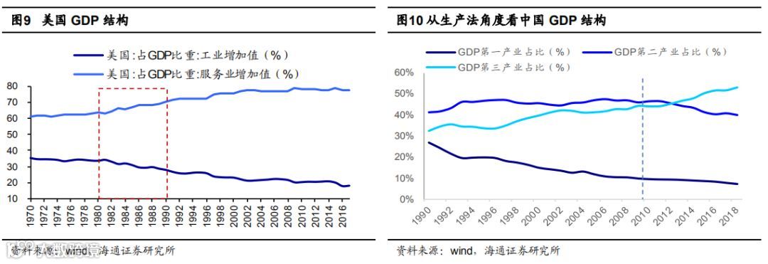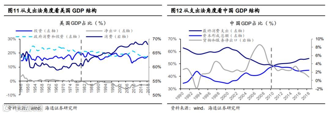 中国有望进入经济平盈利上的阶段。从宏观角度看,我国将和1980年代美国一样进入GDP走平的时代。类似美国1980年代,我国经济增长正在从重速度向重质量转变。2010年以来,我国经济转型速度在加快。从GDP生产法看,2010-18年期间我国第三产业GDP占比从44.2%提高到53.3%,第二产业GDP占比从46.5%降至39.7%,工业增加值累计同比增速从2010年末的15.7%持续下滑至2019/11的6.2%。从GDP支出法看,2010-18年期间我国消费占比从48.5%升至53.6%,而投资从47.9%降至44.8%,净出口从3.7%降至0.8%。这些数据均显示着我国如同80年代美国一样处在产业结构的转型期。过去在我国经济高增长阶段主要依赖投资和出口,现在虽然经济增速放缓,但经济结构在改善,消费、服务业占比在提高。未来我国经济有望进入平稳增长阶段,在此背景下,股市的估值也会更加平稳。