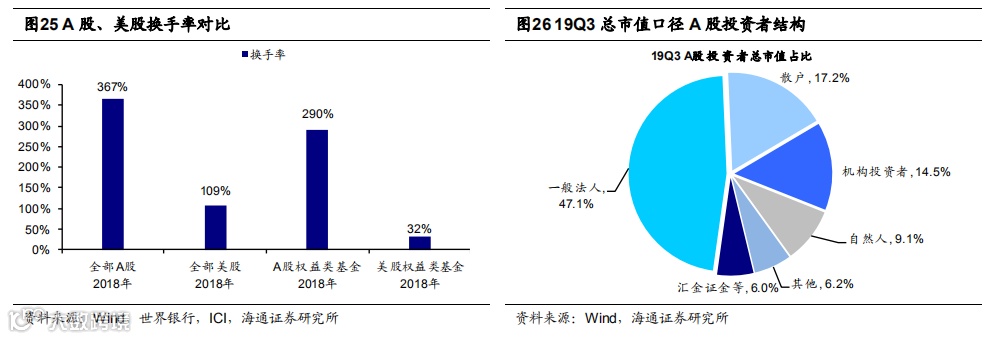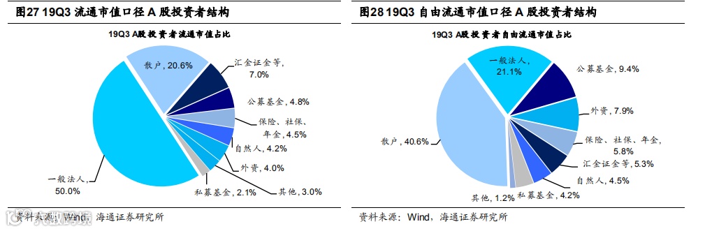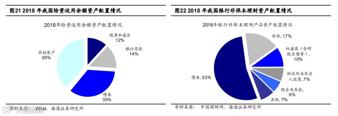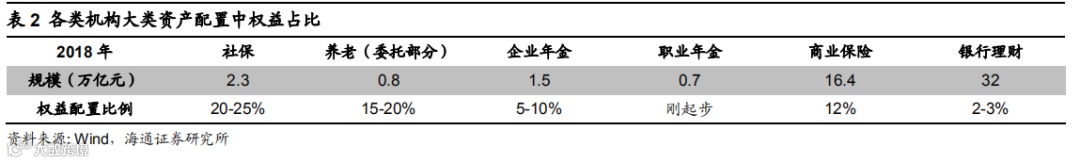 机构方面,过去刚兑的存在使得我国非标资产的性价比比权益资产更高,因此险资和理财资金均配置了大量非标资产来拉动组合的收益率。但是未来金融供给侧改革大背景下刚兑信仰将被打破,一方面非标资产的高性价比将难以为继,另一方面无风险利率下行将抬升金融资产的估值,综合来看权益资产性价比上升。目前我国保险类资金综合持股比例不到10%,分项来看,2018年我国社保规模和持股比例分别为2.3万亿元、20-25%,养老(委托部分)0.8万亿元、15-20%,企业年金1.5万亿元、5-10%,职业年金0.7万亿元、刚起步,商业保险16.4万亿元、12%。银行理财2018年规模为32万亿元人民币,持股比例也只有2-3%,未来这些长线资金入市潜力还很大。