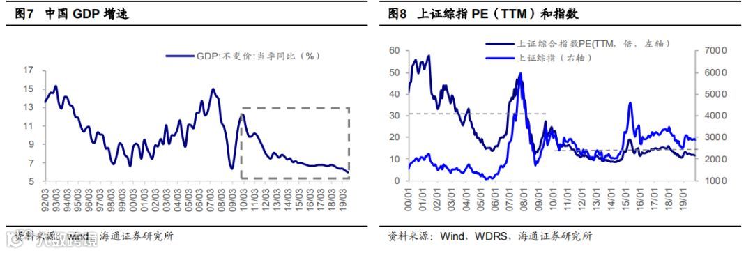 2010年以来我国也处于经济增速换挡阶段。从2010年以来我国经济增速持续回落,我国实际GDP同比从2010Q1高点12.2%降至19Q3的6.0%。从产业结构来看,2010年以来我国产业结构快速调整,从GDP收入法看,2010-18年期间我国第三产业GDP占比从44.2%提高到52.2%,提高了8个百分点。从GDP支出法看,2010-18年期间我国消费占比从48.5%升至53.6%,而投资从47.9%降至44.8%,净出口从3.7%降至0.8%,详见《企业盈利和GDP最终分化——借鉴美国、日本经验-20190819》、《当前中国对比1980年代美国系列(1-3)-201805》。2010年以来伴随我国经济增速放缓,股市估值中枢也在下移,全部A股PE(TTM,整体法)从2010年初的31.6倍降至目前(2019/12/16)的16.9倍,上证综指PE从24倍降至目前的12.8倍。