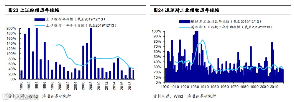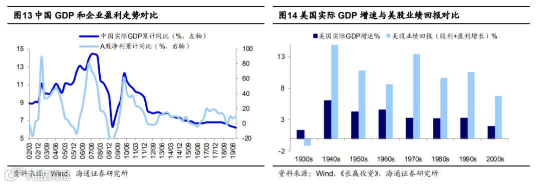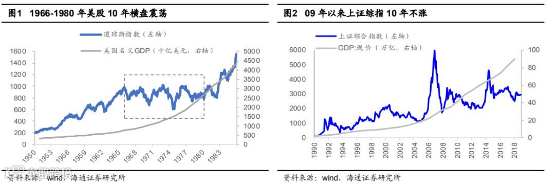 在20世纪70年代末,大量美国投资者认为“股票死了”,这背后源于美股在70年代的整整10年里一直横向整理,股市收益率大幅跑输商品期货、不动产和收藏品。具体来看,美股其实从1966年初已经进入横盘震荡阶段,标普500指数从1966/1最高的94点涨至1980/2最高的105点,道琼斯指数从1966年初最高的1001点至1980/11最高的1000点。而同期美国名义GDP增长了3.5倍,年化名义同比增速9.4%,实际GDP平均同比增速为3.3%。与1970年代的美股类似,从上证综指角度来看A股也10年不涨,上证综指从2009年最高的3478点至2019年以来最高的3288点,上证综指也十年横盘震荡。