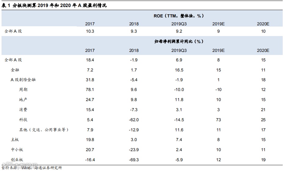 从A股估值角度来看,当前A股整体估值处于低位,和前四次市场底及年初低点基本接近。目前全部A股PE(TTM,整体法)(截至2019/12/16,下同)为16.9倍、处于2005年以来自下而上24%分位。未来随着我国经济进入平稳增长阶段和产业结构的调整,A股中科技、消费板块权重将进一步提高,金融地产板块估值有望回升,将推动A股整体估值水平上升。从盈利角度看,前期报告《企业盈利和GDP最终分化——借鉴美国、日本经验-20190819》分析过,我国已经进入经济和盈利分化阶段。当前我国经济结构优化、行业集中度提高和企业国际化加速也初见端倪,往后看我国微观盈利将与宏观走势继续分化,我们测算2019年A股归母净利同比为8%,ROE为9%,净利同比在三季度见底,ROE在四季度见底。往后看1.5-2年是业绩回升期,预计届时我国GDP稳定增长,2020年A股利润增速有望回升至15%,ROE升至10%以上,详细行业见下表。