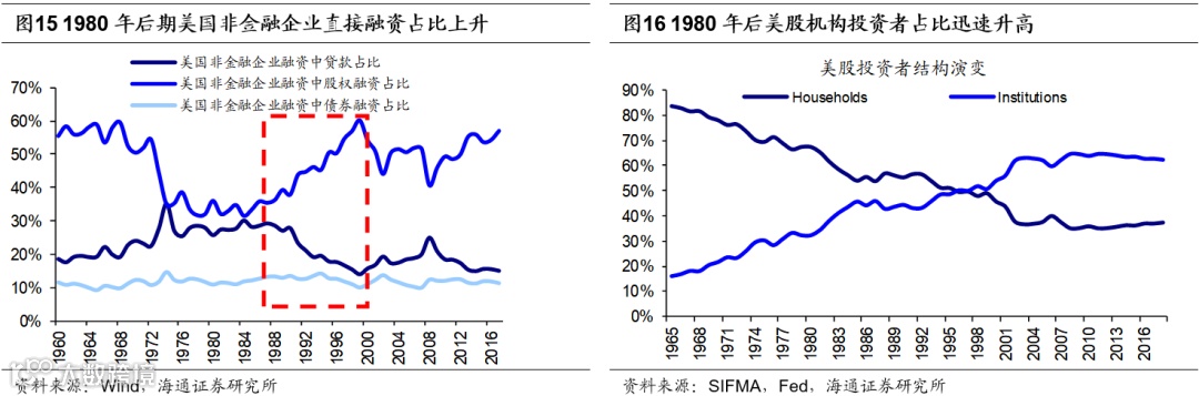 1980年代美国股权投融资大发展催生了股市长牛。1980年代美国的产业结构升级主要指的是以工业主导的产业结构向以科技和消费服务业为代表的产业结构转移。这种产业结构对美国的融资结构提出了新的要求。在过去以工业为主导的传统经济下,工业企业拥有大量的固定资产,扩大生产规模所需资金可以靠向银行抵押资产获得。
