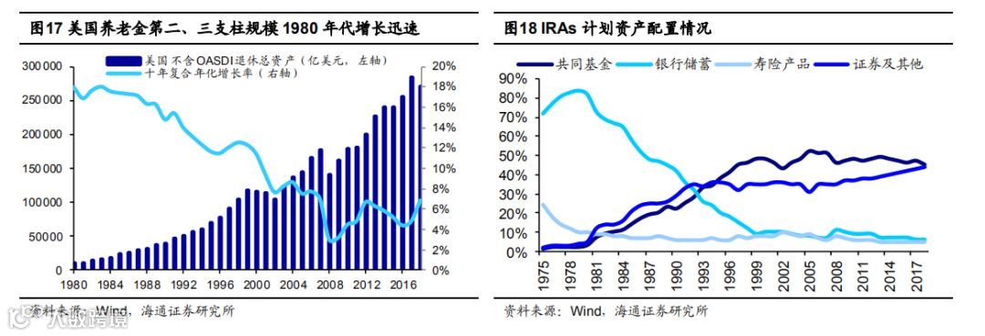 与此同时,以养老金为代表的长线资金也在1980年前后大量进入股市。1974 年美国通过《雇员退休收入保障法案》(即 ERISA 法案),个人退休金账户(即 IRAs 计划)得以诞生。1978年《美国国内税收法案》中的401K条款规定贡献确定型养老金享受税收递延或优惠。IRAs 和 401(K)的推出使得美国养老金规模快速上升,1980年代美国养老金第二三支柱总规模十年复合年化增长率在15%以上。养老金入市的比例也在上升,以IRAs计划为例,1980年后该计划对共同基金的配置比例从1980年的3%上升到2000年的48%,证券及其他资产的比例从5%上升到35%。大量长线资金入市一方面使得美股中机构投资者的占比从1970年的20%快速上升至2000年的63%,另一方面则带动了整个股市估值的提升,1982-2000年期间标普500指数年化收益率15.7%,同期PE涨幅为7.4%,EPS涨幅为7.7%,即指数大约有一半的涨幅是由估值抬升贡献的。