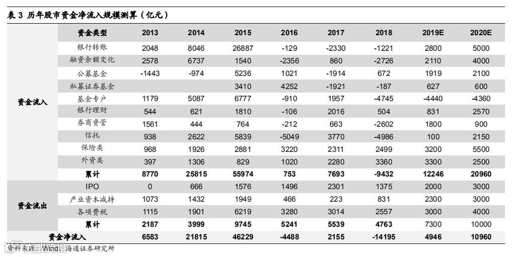 具体到2020年,牛市第二波上涨逐步展开,参考历史,牛市第一阶段资金入场温和、第二阶段入场加速,2019年资金净流入5000亿左右,预计2020年机构和个人权益配置比例将上升,股市增量资金超万亿。