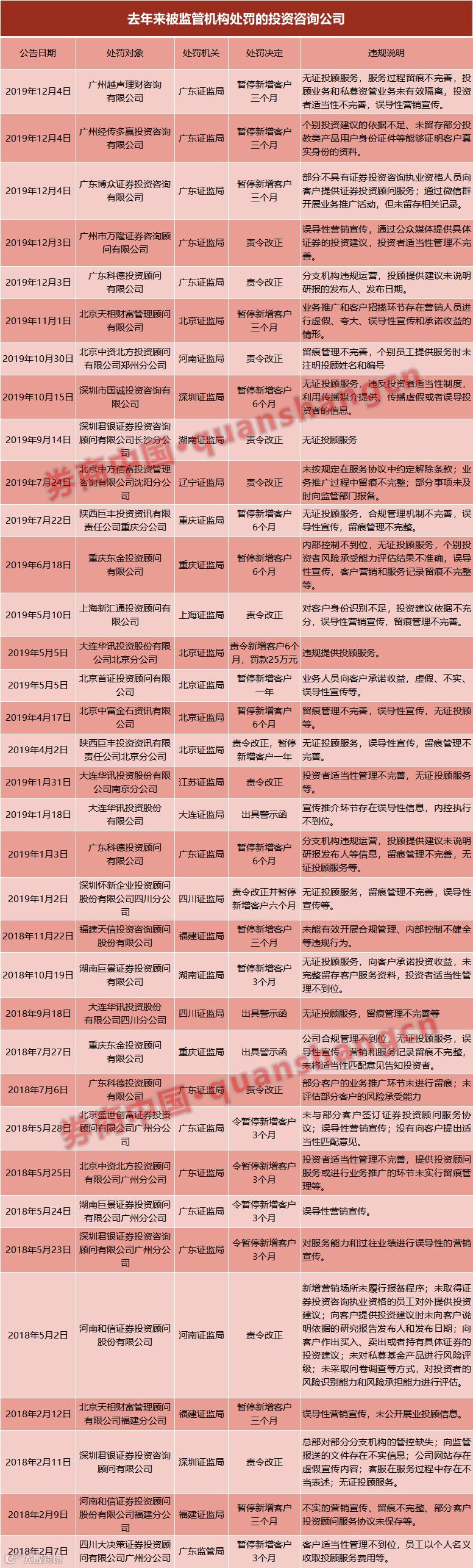 比如陕西巨丰投资资讯有限责任公司、湖南巨景证券投顾公司、河南和信证券投顾公司、广东博众证券投资咨询有限公司、大连华讯投资股份有限公司等等,其中陕西巨丰、大连华讯均有数个分支机构曾因无证投顾提供服务而受罚。
