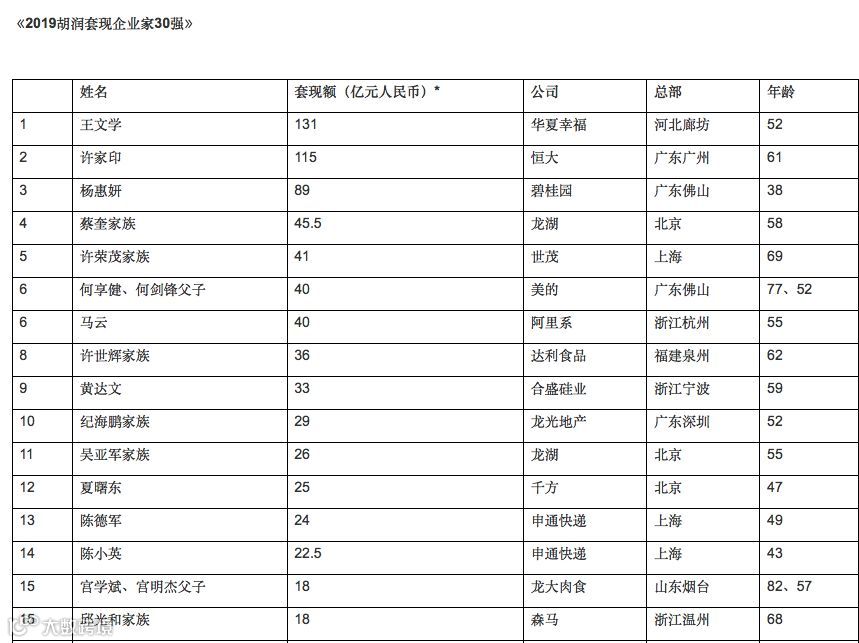 11月21日,胡润发布《2019胡润套现企业家30强》,52岁的王文学通过减持A股上市公司华夏幸福、ST宏盛部分股权以及通过获得上市公司华夏幸福过去一年的分红累计套现131亿元,位列今年胡润套现企业家榜第一位。
