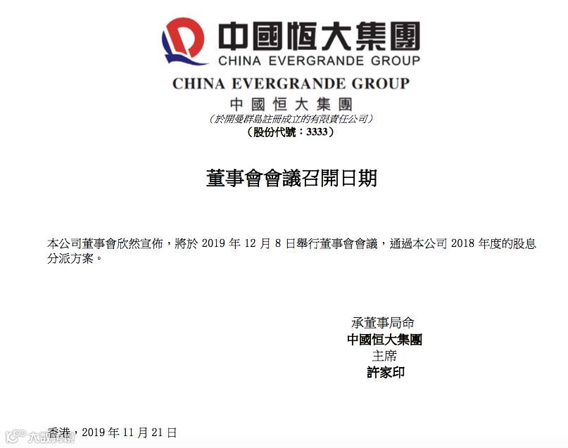 11月21日,中国恒大(3333,HK)发布公告称,将于12月8日举行董事会会议,通过2018年度的股息分派方案。