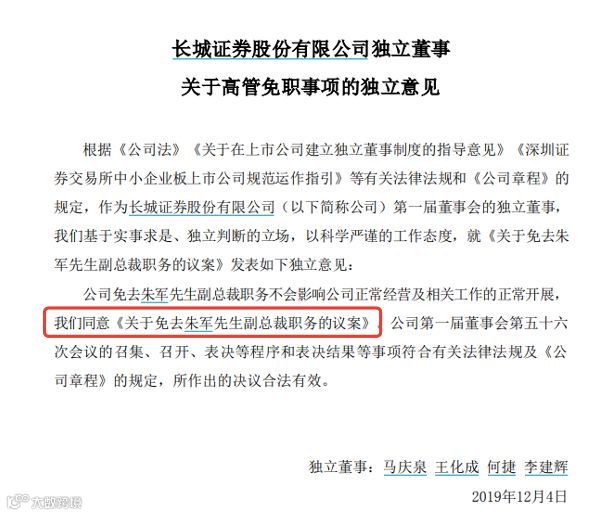 公告显示,12月4日,长城证券第一届董事会第五十六次会议上,出席会议的12名董事全票同意免去副总裁朱军的职务,且四名独立董事表示同意这一决定,并认为公司免去朱军副总裁职务不会影响正常经营及相关工作的正常开展。