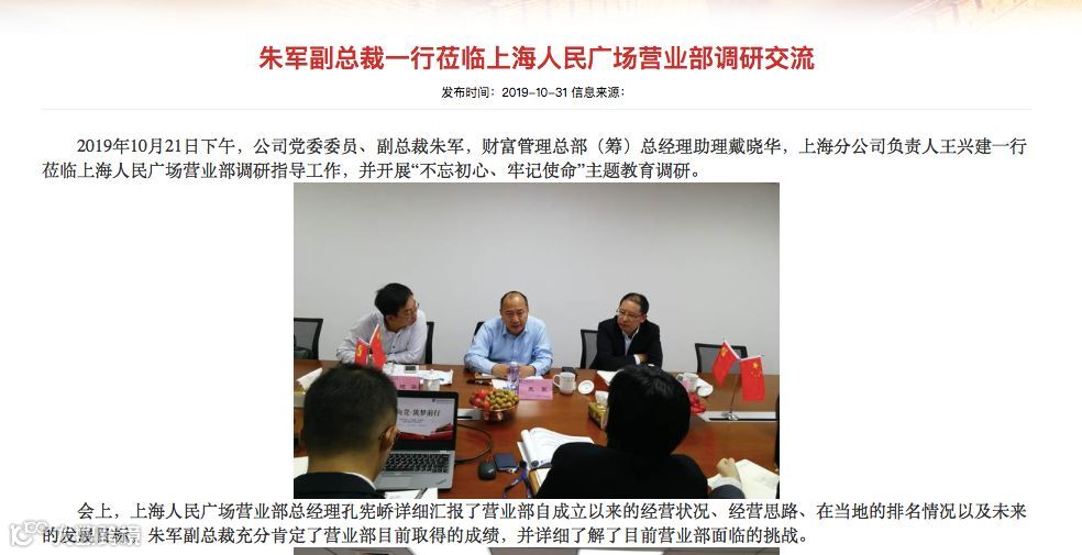 长城证券官网10月31日挂出的新闻显示,2019年10月21日下午,公司党委委员、副总裁朱军,财富管理总部(筹)总经理助理戴晓华,上海分公司负责人王兴建一行莅临上海人民广场营业部调研指导工作,并开展“不忘初心、牢记使命”主题教育调研。