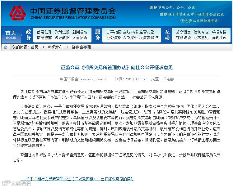 11月15日,中国证监会发布公告,就修订后的《期货交易所管理办法》(下称办法)向社会公开征求意见。本次修订涉及面很广,在强化期货交易所一线监管方面调整力度最大,其中首次增加实际控制账户和程序化交易管理规定,对国内期货交易所和期货市场的规范发展将带来深远影响。