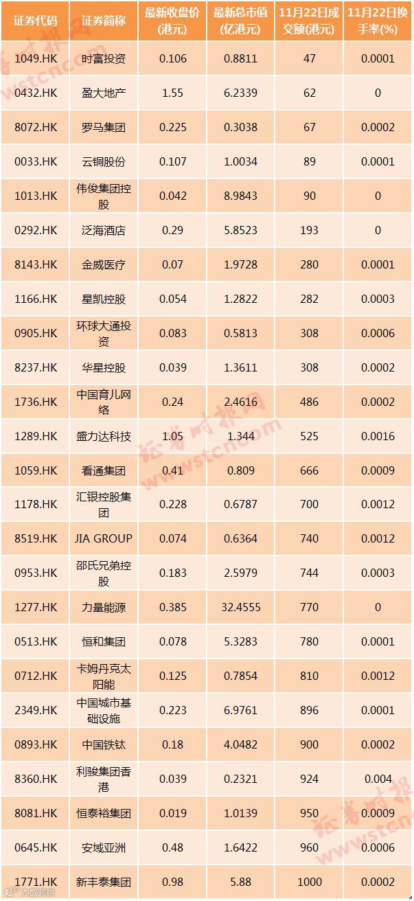 以下为11月22日成交额≤1000港元的个股名单: