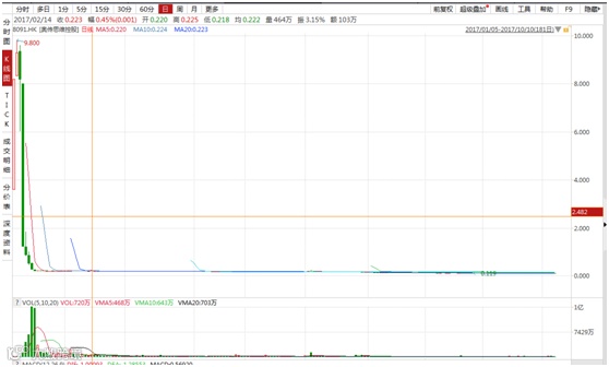 比如奥传思维控股(8091.HK)为例,2017年1月9日至1月16日期间,公司股价累计跌幅97.64%,股价从最高9.8港元跌至最低价0.215港元。倘若觉得这个价格已经跌到位并买入,截至周五收盘,该股至今累计跌幅78%。