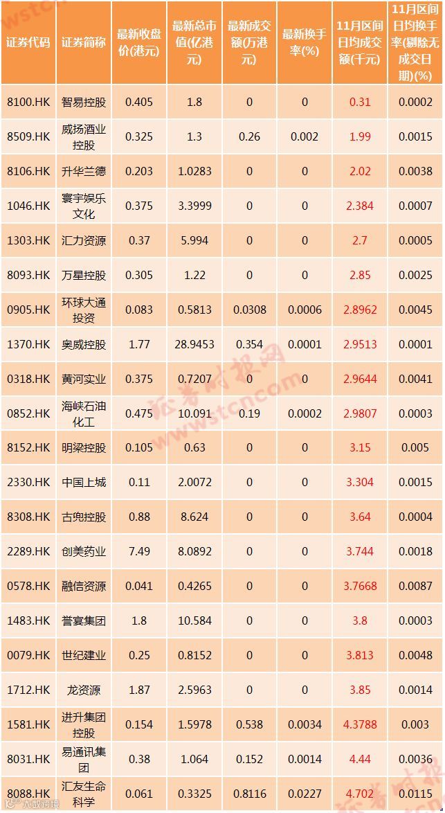 11月份日均成交额在1万港元以下的个股名单: