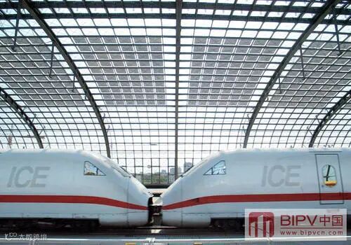 德国战后最大的建筑工程:耗资7亿欧元、历时10年时间精心打造的柏林中央火车站在位于柏林市中心的施普雷河河畔,且被誉为欧洲最美的火车站。在450米长东西走向的站台拱形玻璃屋顶上集成安装了大约1870平方米的太阳能发电光伏组件。以玻璃和钢为主要建材,透光性很好。光伏项目保持了一定的透光性,不但没有影响光照,而且减轻了阳光曝晒。光伏与建筑的融合做得非常好。