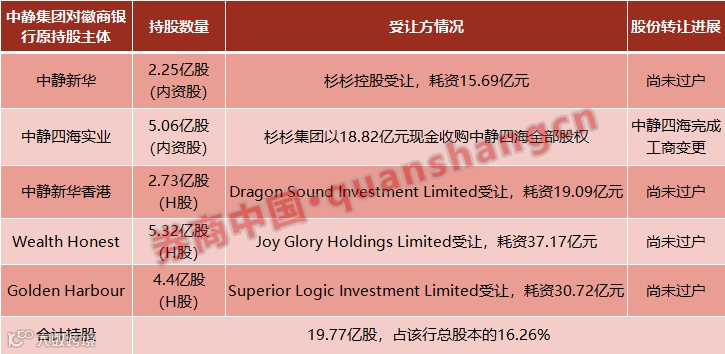 19.77亿股股权都来自于上海中静(实业)集团(下称“中静集团”)。今年8月,中静集团公告“清仓”徽商银行。