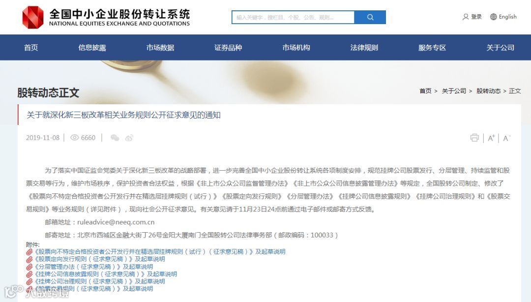 11月8日,证监会和股转公司就深化新三板改革相关业务规则公开征求意见,内容涉及精选层准入标准,建立转板上市机制、优化发行制度、优化投资者结构等多个方面。