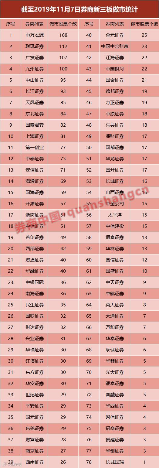 在做市方面,截至11月8日,共有78家券商参与了新三板股票的做市。其中,仅有申万宏源、联讯证券、广发证券、九州证券四家券商的做市股票不少于100只,分别为168只、112只、107只和100只;另有60家券商的做市股票均不超过50只,甚至有17家券商的做市股票仅为个位数。