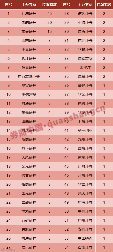 在推荐挂牌业务方面,wind数据显示,共有54家主办券商参与了今年221家新三板企业的推荐挂牌,除开源证券45家、国融证券20家和东吴证券15家外,其余51家券商的推荐挂牌企业数量均在8家以内,甚至有39家券商的推荐挂牌企业数量不超过3家。