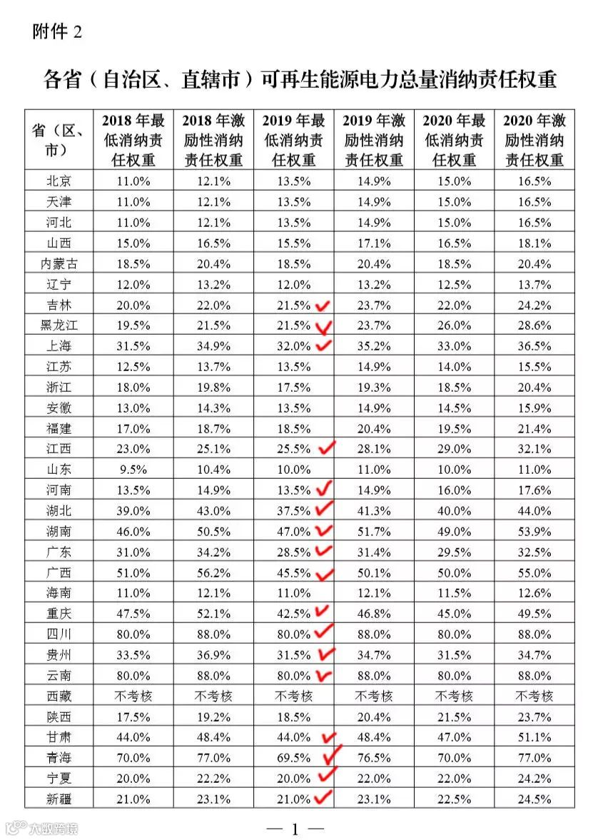从附件权重的表格中,可以看出吉林、黑龙江、上海、江西、河南、湖北、湖南、广东、广西、重庆、四川、贵州、云南、甘肃、青海、宁夏、新疆的可再生电力消纳责任权重超过20%,说明这些省市在2019年对光电、水电、风电等清洁能源的消纳指标较高。