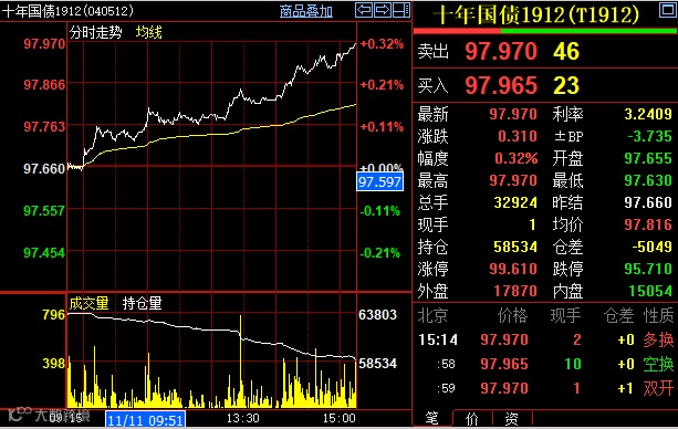 同时,11月11日,国债期货全线收涨,10年期主力合约T1912合约上涨0.32%,5年期主力合约涨0.16%。