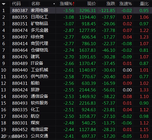 盘面上,行业板块普遍低开,家电股早盘集体低迷。申万28个行业中,家电行业领跌。截至午间收盘,申万家电下跌3.68%。午盘过后,家电板块继续低迷,截至收盘,板块整体下跌近4%,市值蒸发月500亿。