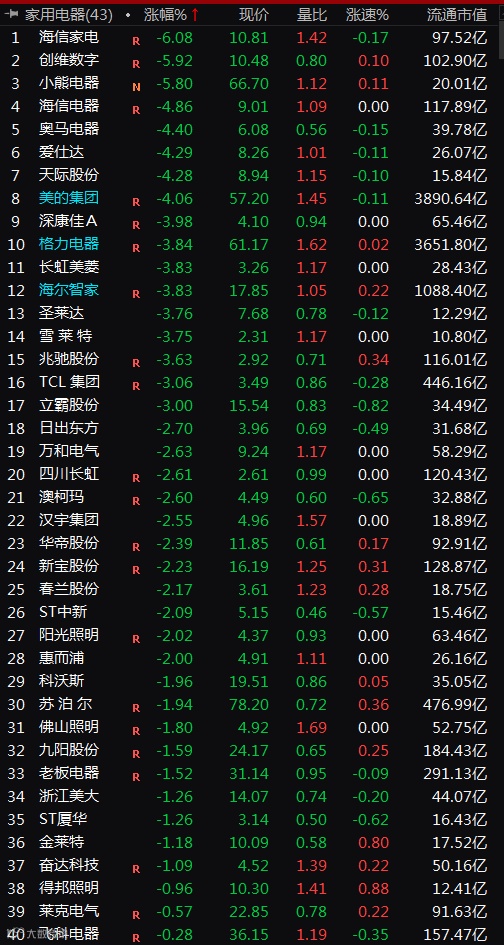 个股方面,海信家电大跌逾6%,创维数字、小熊电器跌逾5%,海信电器、奥马电器、爱马仕、美的集团等涨逾4%。