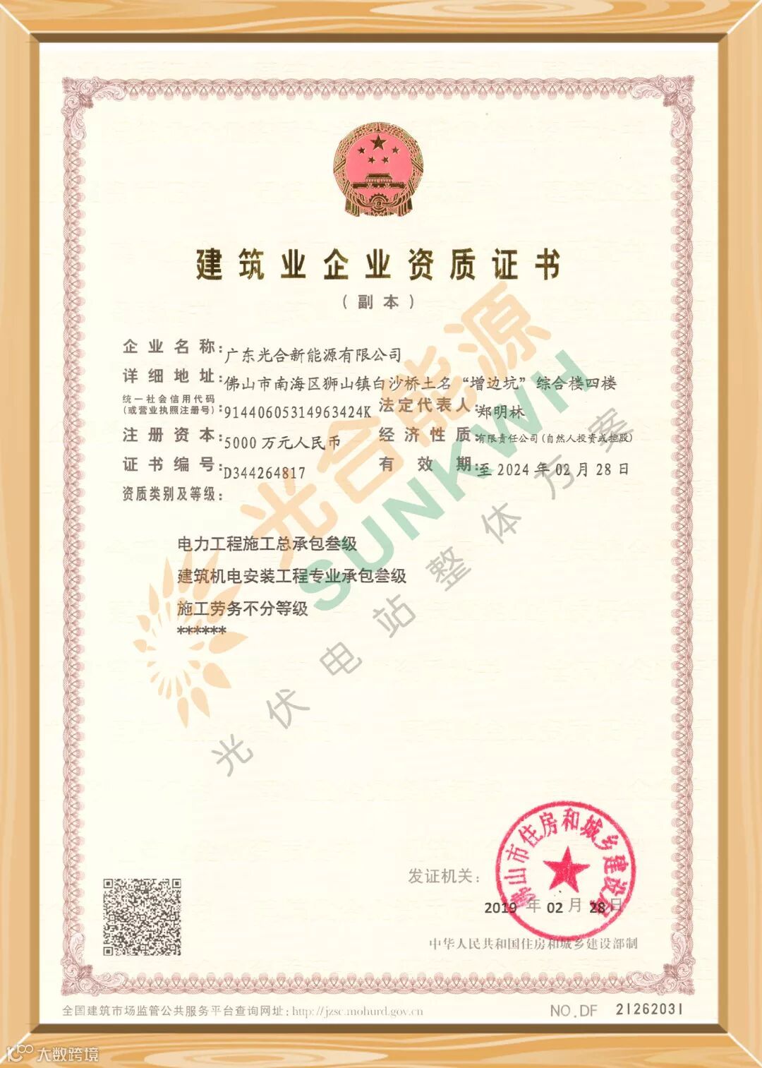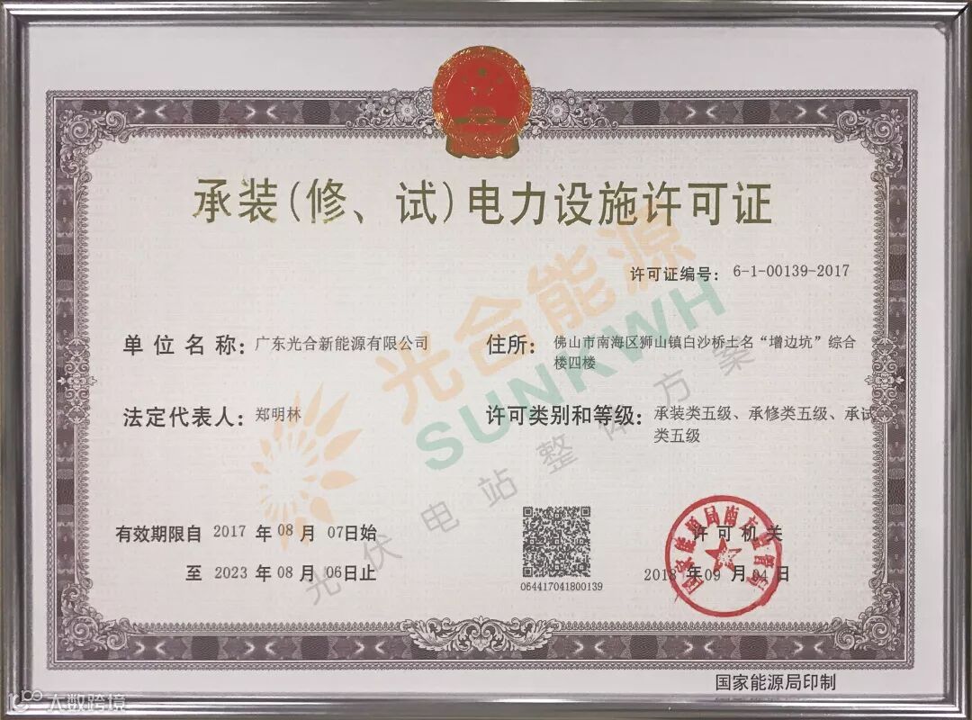 光合能源,获得建筑业企业资质及五级电力施工资质《承装(修、试)电力设施许可证》,实力雄厚,自主研发并拥有多项支架专利、防水专利,技术实力在业界享有盛誉。