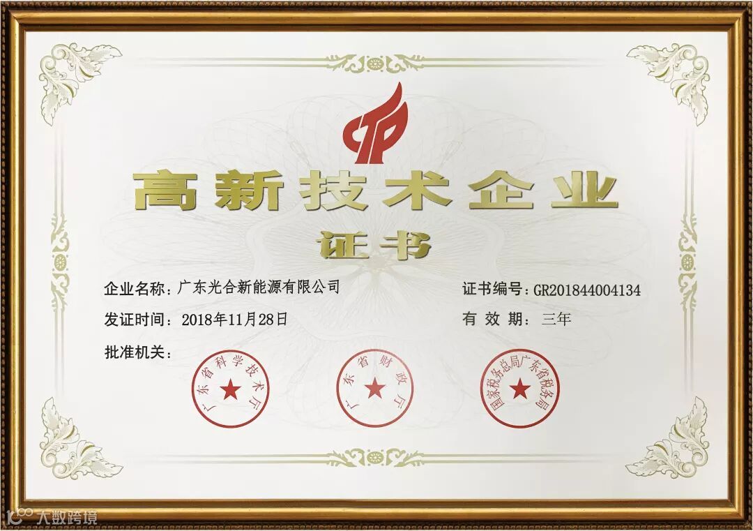 经广东省科学技术厅、广东省财政厅、国家税务总局广东省税务局的严格测评,光合能源凭借雄厚的技术实力通过了层层审核,最终荣获广东省“高新技术企业”荣誉称号!