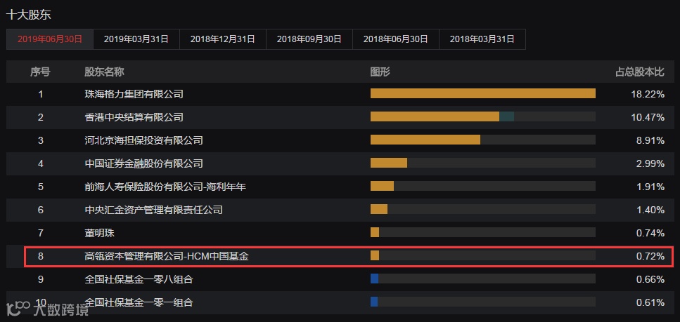 2018年二季度,高瓴减持504万股格力。最终,高瓴持有4339.64万股,一直至格力今年半年报,位列第八大股东。