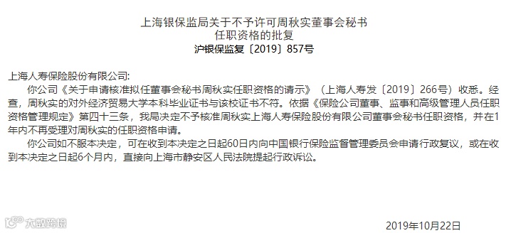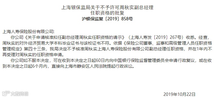 10月25日,上海银保监局公布两份不予许可任职资格的批复公告,称“经查,周秋实的对外经济贸易大学本科毕业证书与该校证书不符”,为此,上海银保监局决定不予核准周秋实上海人寿副总经理和董事会秘书任职资格,并在1年内不再受理对周秋实的任职资格申请。